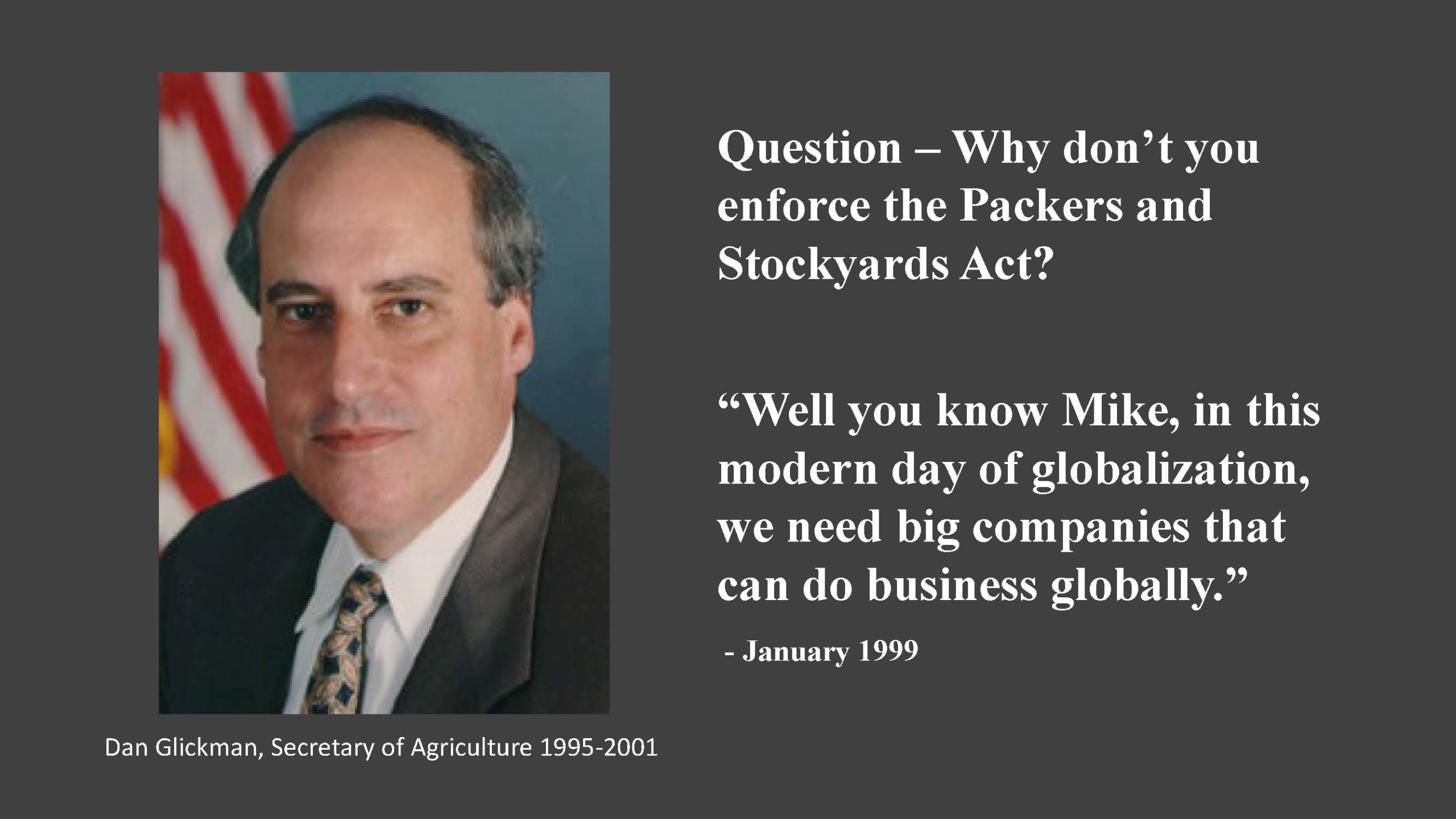 So, asking the question, why are cattle producers going broke while consumers pay record high prices for beef? It’s the abusive market power of powerful middlemen – the big meatpacker, big retailers, and big food service cartel. Until the government breaks up this concentrated power, we will continue to lose more and more food producers and will become less and less able to feed ourselves.